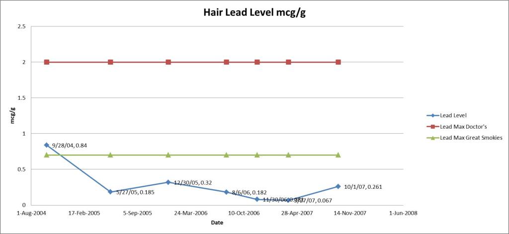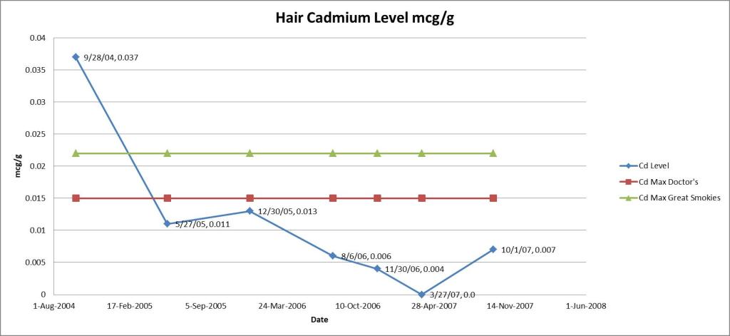 Cadmium levels: Cadmium comes out as the mercury comes out. This comes from cigarette smoke but I don’t smoke. Tobacco is really good at absorbing it from the soil so if you smoke or around cigarette smoke like in a bar you will get some cadmium. You could theoretically also get this from nickel cadmium batteries but now they are all now NiMh.