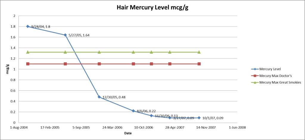 Hair supposedly picks up mostly methyl mercury aka organic mercury from fish (Hg-CH3). However I rarely ate fish so it must have come from the teeth as the primary care doctor said. Note how the hair mercury level which is really blood mercury level declines after removal. Mercury vapor gets into the bloodstream via the lungs. From there hair is built from blood. So from there we can deduce that the dental amalgams were the source as I made no other changes in lifestyle. I lived in the same city apartment and ate the same things as usual for the next several years. The only variable was the dental mercury amalgam removal. The actual blood level of mercury may have been much higher as hair is supposedly poor at capturing inorganic mercury.