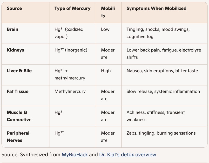 Back pain or pain the kidneys; Mercury in kidney mobiliztion. Inorganic mercury comes out mainly via the kidneys by urine so we want to drink plenty of water. Both compounds.