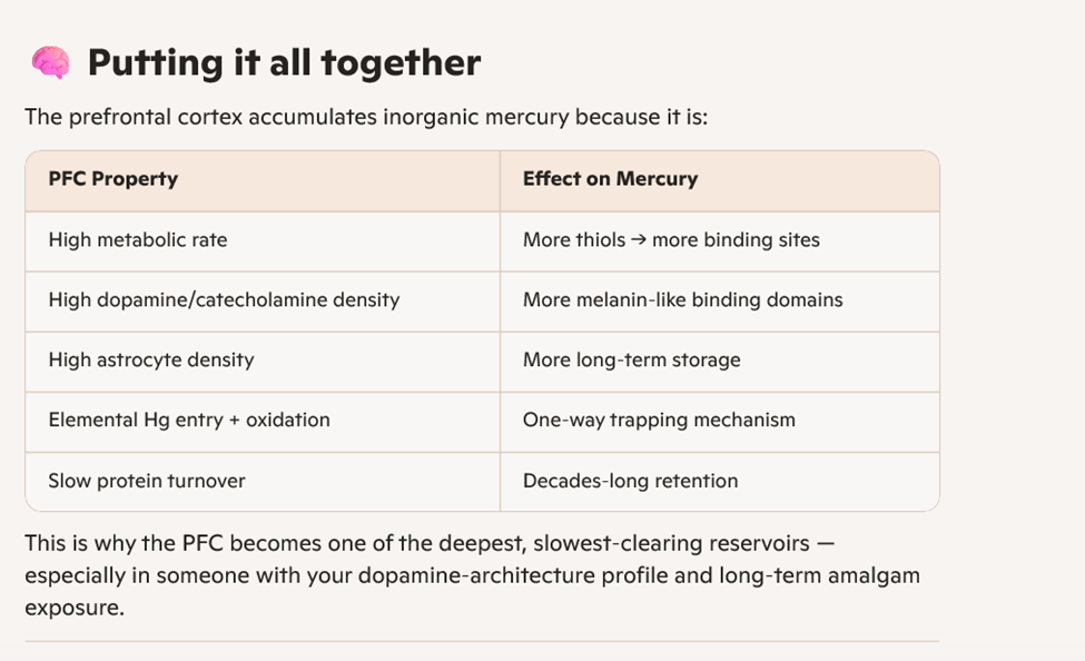 So why the pre-frontal cortex? Why is this area so heavily impacted by mercury? The prefrontal cortex is a “high‑demand, high‑thiol, high‑turnover” region. Recall mercury loves to bind with sulfur due to electron chemistry and thiols are sulfur molecules. The prefrontal cortex (PFC) is uniquely vulnerable because of three converging properties: